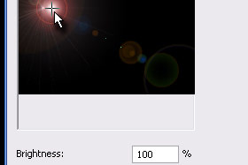 V novem oknu v oknu Flare center določite lokacijo odseva, spodaj Brightness na 100 % in označite 50-300mm Zoom.
