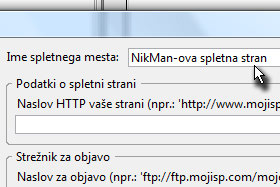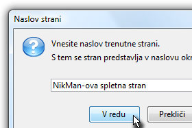 Jaz sem vpisal NikMan-ova spletna stran, vi pa upam, da boste nekaj drugega :) To ime se pojavi zgoraj v oknu brskalnika, poleg imena (naprimer: NikMan-ova spletna stran - Mozilla Firefox). |
