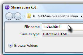 V oknu z raziskovalcu določimo še prej ustvarjeno mapo in shranimo pod datoteko index.html.