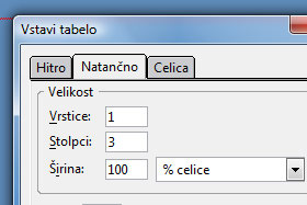 Odpre se novo okno, kjer kliknete na zavihek Natančno in nato v polje Vrstice vpišete 1 in Stolpci 3. Širina določite 100 in poleg % okna (glej sliko). Okvir določite 0 in nato kliknite na gumb Napredno spreminjanje, kjer ponovno določite cellspacing in cellpadding vrednost na 0. Potrdite spremembe dvakrat na gumb V redu. Spodaj se pojavi nova vrstica tabele, kjer kliknite vanjo in nato pritisnite tipko DEL. Tukaj smo točneje pobrisali prazno vsebino zgornje celice, deluje pa kot da je nova. |
