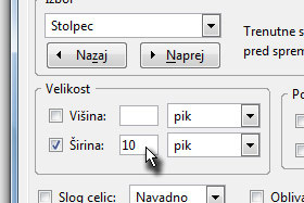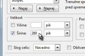 V novem oknu v polju Velikost označite Širina in vpišite 280 pik ter potrdite na gumb V redu.