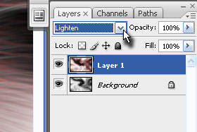 Sedaj določite layerju še senčenje na Lighten, kot je razvidno na desni sliki.