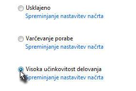 Če boste izbrali Visoka učinkovitost delovanja, bo vaš notesnik deloval z polno paro.