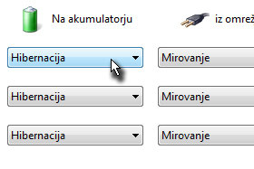 Jaz sem nastavila, da se mi notesnik na akumulatorju hibernira, iz omrežja (elektirka) pa da gre v stanje mirovanja.