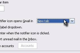 Odpre se novo okno, kjer pri polju "clicking the notifier icon Opens Gmail in" izberete New Tab.