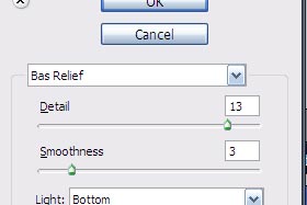 Zopet uporabimo nov filter prek menija Filter >> Sketch >> Bas Relief in uporabimo naslednje vrednosti: