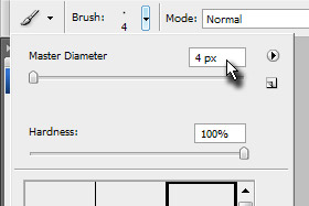 Pritisnite CTRL + SHIFT + N da naredite nov layer, izberite Brush Tool nastavite foreground na #ffffff (bela), Master Diameter na 4px in Hardness na 100%.