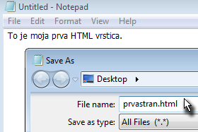 HTML lahko pišemo kar v beležnici. HTML datoteke imajo končnico .html ali .htm. Odprimo beležnico ter vanj zapišimo: