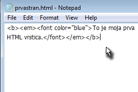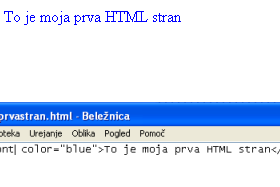<font color="blue">To je moja prva HTML stran</font> Shranimo in si ogledamo rezultat. Besedilo je modro. |