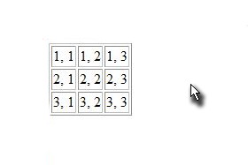 Značka za vrstico je <tr> za stolpec pa <td>. Zapišemo takole: <table border="1"> <tr><td>1, 1</td><td>1, 2</td><td>1, 3</td></tr> <tr><td>2, 1</td><td>2, 2</td><td>2, 3</td></tr> <tr><td>3, 1</td><td>3, 2</td><td>3, 3</td></tr> </table> Border označuje debelino tabele. |