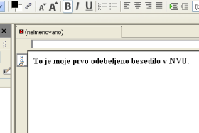 <a href="www.google.com">Pojdi na Google</a> Sliko vstavimo s kodo: <img src="slika.jpg" /> To so osnove. Več vam ne bom pisal. Zakaj? Zato, ker greste v NVU in tam prosto oblikujete, HTML pa se sam piše (pravzaprav je tisto XHTML več o tem na internetu). Kot sem omenil, NVU vam piše XHTML, ki je nadgradnja sedanjega html. Prav zaradi tega se naprimer odebeljen tekst ne napiše več <b> ampak s posebno značko <span> oz <style>. Zapišete lahko kakorkoli vendar za kasneje predlagam span ter style. Odprimo NVU (oz. vaš program za spletne strani). Zapišimo besedilo in ga naredimo odebeljenega. |