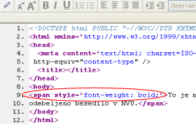 V headu napišemo avtorja, kodiranje, naslov. Potem pa pride na vrsto <body>. Tukaj je vsa koda, ki se prikaže. Odebeljen tekst se bo zapisal kot <span style="font-weight: bold;"> . |