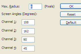 ![]() Podvojite layer (CTRL+J) in nato kliknite Filter, Pixelate, Color Halftone. Odpre se vam novo okno. Osredotočimo se na Max. Radius. Vrednost, za katero se boste odločili, je odvisna od velikosti fotografije in vašega okusa. |