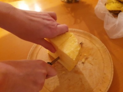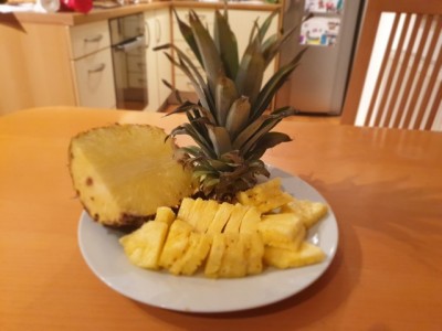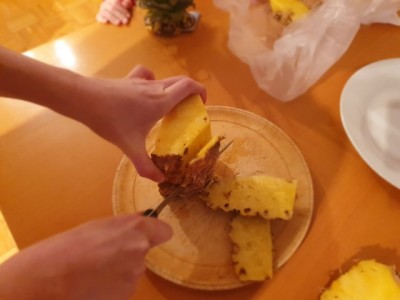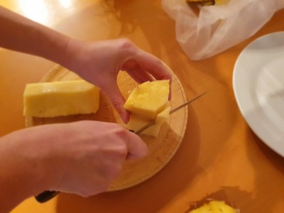 Na koncu že narežite olupljen ananas na male koščke in si ga posrezite.