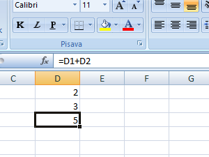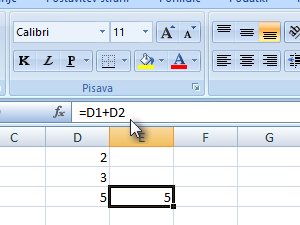 V Excelu imamo formulo =D1+D2, katero želimo skopirati v drugo celico.