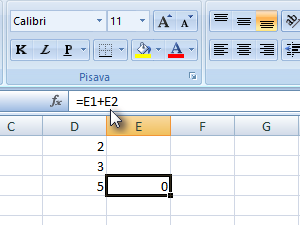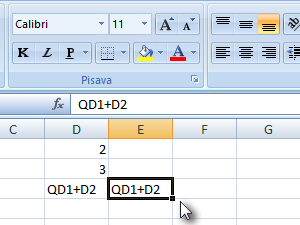 ![]() Vendar pa, ko celico skopiramo, bo Excel pri tem avtomatsko popravil vrednosti v formuli za toliko, kolikor je zamaknjena celica. V mojem primeru je tako formulo =D1+D2 spremenil =E1+E2. |