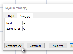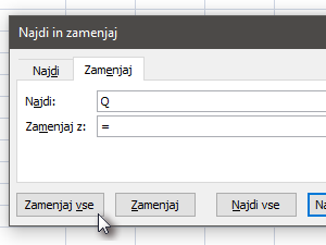 ![]() V kolikor želimo ohraniti isto vrednost formule, se lahko poslužimo enostavnega trika. Pritisnemo kombinacijo tipk Ctrl + H, da odpremo okno za zamenjavo teksta. V polje najdi vpišemo =, v polje zamenjaj pa vpišemo znak, ki se ne uporablja drugje v dokumentu, v mojem primeru črko Q. S klikom na gumb Zamenjaj vse opravimo zamenjavo. |