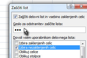 ![]() V novem oknu določite poljubno geslo (ki ga bo po potrditvi tega okna potrebno vnesti še enkrat za večjo varnost) in spodaj označite Izbira nezaklenjenih celic. |