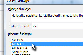 ![]() V novem oknu Izberite zvrst preko izbirnika določite Vse in spodaj v polju izberite funkcijo AVERAGE ter potrdite na gumb V redu. |