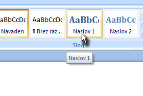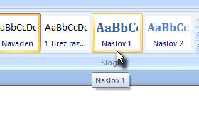 ![]() Nato pa v oknu Slogi kliknite na slog imenovan Naslov 1 (glej sliko). |