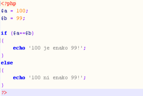 <?php $stranicaA = 5; //določimo stranico a $stranicaB = 10; //določimo stranico b $ploscina = $stranicaA * $stranicaB; //določimo ploščino echo 'Ploščina kvadrata s stranicama 5 ter 10 je enaka ' .$ploscina; ?> Z piko (.) smo torej združili besedilo z vrednostjo spremenljivke. Gremo naprej. Na stavek IF. V prevodu to pomeni "če". Torej v stavek vnesemo naprimer 5=10 in stavek nam bo vrnil false (neresnično). Poglejmo si primer. <?php $a = 100; $b = 99; if ($a==$b) { echo '100 je enako 99!'; } else { echo '100 ni enako 99!'; } ?> Izpisalo se bo: 100 ni enako 99! To pa je že zapleteno kajne? Podrobneje si poglejmo stavek IF. Dobro se ga naučite saj je zelo pomemben. Najprej zapišemo if nato v oklepajih navedemo pogoj. Uporabimo operator ==, ki pomeni je enako < manjše kot, > večje kot, <= manjše ali enako, => večje ali enako, != ni enako. Kot pri matematiki uporabnimo tudi logične operatorje kot so AND (&&) OR (||) ter NOT (!). Nato pride na vrsto zaviti oklepaj zatem pa stavki, ki se naj izvedejo, če je pogoj resničen. Sledi zaviti zaklepaj. Če želimo, da se nekaj izvede, ko je stavek neresničen zapišemo še else, zaviti oklepaj, stavke ter zaviti zaklepaj. |
