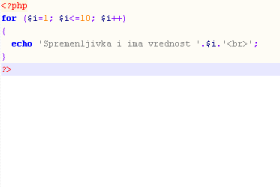 <?php for ($i=1; $i<=10; $i++) { echo 'Spremenljivka i ima vrednost '.$i.'<br>'; } ?> Izpisalo se bo: Spremenljivka i ima vrednost 1 Spremenljivka i ima vrednost 2 Spremenljivka i ima vrednost 3 Spremenljivka i ima vrednost 4 Spremenljivka i ima vrednost 5 Spremenljivka i ima vrednost 6 Spremenljivka i ima vrednost 7 Spremenljivka i ima vrednost 8 Spremenljivka i ima vrednost 9 Spremenljivka i ima vrednost 10 Zanka se je izvedla desetkrat oz. dokler $i ni bil večji ali enak 10. Prvi argument v zanki for je implementacija spremenljivke. V tem primeru spremenljivki $i določimo vrednost 1. V drugem argumenti zapišemo pogoj v tem primeru ponavljaj zanko dokler $i ne bo večji ali enak 10. V tretjem argumentu pa določimo, kaj naj se naredi ko se posamezna zanka konča. $i++ pomeni da se spremenljivka poveča za 1. Prav tako bi lahko napisalo $i-- ali pa $i** . |