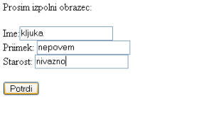 <?php $ime = $_GET['ime']; $priimek = $_GET['priimek']; $starost = $_GET['starost']; echo 'Ime vam je '.$ime.' pišete pa se '.$priimek.'. Stari ste '.$starost.' let.'; ?> Sedaj odprite obrazec.html ter vpišite podatke. Kliknite Potrdi. Odprla se bo stran stran.php kjer bodo izpisani vaši podatki. Če pa dobro pogledate v vrstico z URL-jem bodo noter zapisani vaši podatki. Obrazec je torej odprl stran localhost/stran.php?ime=kljuka&priimek=nepovem&starost=nivazno&potrdi=Potrdi Vsi podatki iz obrazca so se prenesli v URL nato pa s pomočjo $_GET spet napisali. |