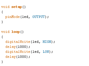 ![]() Nato spustimo nekaj vrstic in napišemo naslednje: void setup() { pinMode(LED, OUTPUT); } S tem podatkom krmilniku povemo ali je določen pin VHOD(input) ali IZHOD(output).