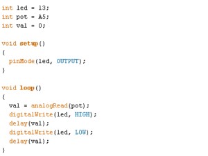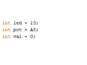 ![]() In še v tretji vrstici malo spremenimo program: void loop() { val = analogRead(pot); digitalWrite(LED, HIGH); //vključi led delay(val); //počakaj x sekund digitalWrite(LED, LOW); //izključi led delay(val) //počakaj x sekund } val = analogRead(pot); S tem podatkom smo krmilniku povedali, da je neznanka val enaka analognemu vhodu. delay(val); S tem podatkom smo krmilniku povedali, da je "odmor" odvisen od analognega vhoda.