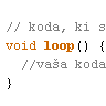 ![]() Spet spustimo nekaj vrstic in napišemo: void loop() { digitalWrite(LED, HIGH); //vključi led delay(1000); //počakaj 1s digitalWrite(LED, LOW); //izključi led delay(1000); // počakaj 1s } S tem podatkom krmilniku povemo kaj naj oz. kako naj to počne. Funkcija loop() se bo izvjajala znova in znova v neskončnost.
