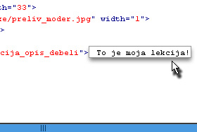Sedaj z miško preletite stran. Izrisovali se bodo modri okvirji v oknu z HTML-jem pa se bo spreminjala koda. Postavite se naprimer na neko sliko ter kliknite.