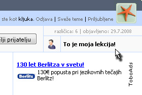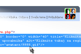 Spodaj imate označeno značko img kateri lahko potem spreminjate lastnosti. Kliknite na sliko ob svojem avatarju zgoraj. Sedaj spodaj spremenite src="avatars/1.gif" v src="avatars/9999.gif" Namesto 1.gif imate vi svojo številko slike. Če sedaj pogledate vašo avatarsko sliko ste dobili NikMan-ovo čeprav je ni mogoče izbrati :) |
