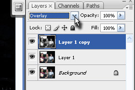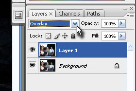 Pritisnite tipki CTRL + J, da duplicirate layer in mu potem določite senčenje na Overlay (glej sliko).