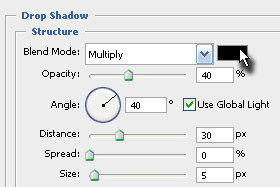 Potem pa določite črno barvo (glej sliko), Blend Mode na Multiply, Opacity na okoli 40 %, Angle 40 stopinj, Distance 30 px in Size 5 px. Kliknite na gumb OK. |