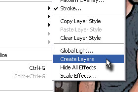 Kliknite sedaj zgoraj na Layer, Layer Style in izberite Create Layers. |