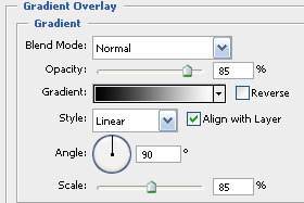 V novem oknu določite Blend Mode na Normal, Opacity 85 %, Style Linear, Angle 90 stopinj in Scale 85 %. Potrdite na gumb OK. |