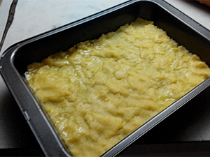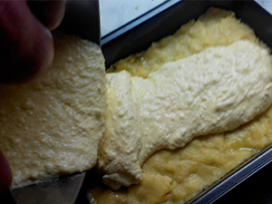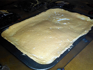 Po pol ure vzamemo iz hladilnika testo, ga razvaljamo in namestimo v pekač. Lahko ga namestimo kar z rokami.