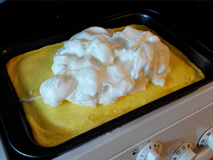 2. nadev iz snega in sladkorja položimo na 1. skutin nadev in ga enakomerno poravnamo.