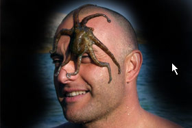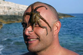 Jago in hobotnica mi smehljaje pozirata v fotoaparat.