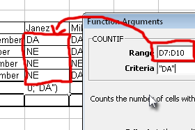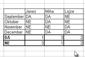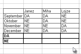Imamo tabelo z nekimi podatki. Želimo izračunati število "DA" - jev oziroma "NE" - jev.