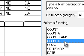 Zgoraj kliknemo tisti f za vstavljanje funkcije. Poiščemo formulo COUNTIF. |