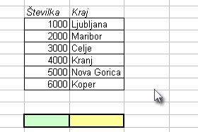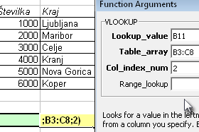 To bo v našem primeru zelena celica. V drugo polje vnesemo celotno tabelo z številkami in kraji. V zadnje polje pa stolpec iz katerega se bo izpisal podatek. V našem primeru iz drugega (imena krajev). Kliknemo OK. |