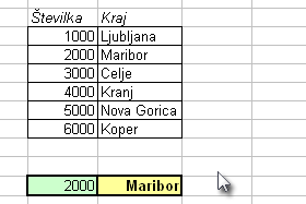 Ko v zeleno polje vpišemo številko želimo, da se v rumenem izpiše kraj.