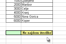 =IF(ISERROR(VLOOKUP(B11;B3:C8;2));"Ne najdem številke!";VLOOKUP(B11;B3:C8;2)) Torej vrhnja funkcija je IF, ki preveri če naša funkcija vrne napako. Če jo napiše Ne najdem številke sicer pa vrne rezultat funkcije. |