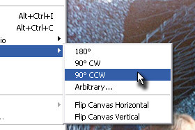![]() Sliko bom sedaj obrnil v pravo smer tako, da bom kliknil zgoraj na Image, Rotate Canvas in izbral 90 CCW. |
