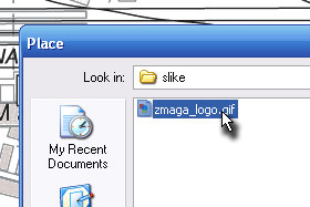 Kliknite zgoraj na File in izberite Place... V novem oknu poiščite in označite vaš logotip in potrdite na gumb Place. |