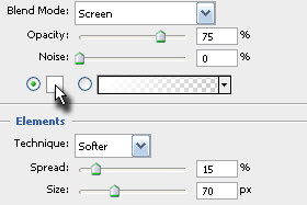 V novem oknu določite belo barvo (glej sliko), Spread 15 % in Size 70 px. Potrdite na gumb OK. |