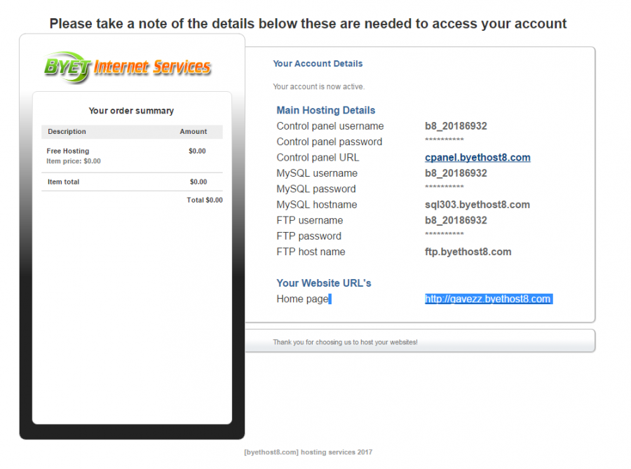 Na strani kliknite na povezavo download (glej sliko), da boste shranili pomembne podatke za dostop do vašega spletnega gostovanja. |
