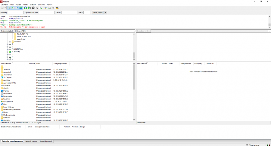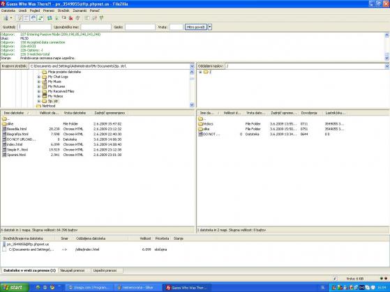 Leva stran so mape in datoteke na vašem računalu, na desni pa FTP strežniku. FTP strežnik je računalnik, kjer gostuje (so shranjene vse datoteke, slike, mape...) vaša spletna stran. |