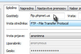 V istem oknu v polje Gostitelj vpišite ftp.phpnet.us oziroma podatek, ki ste ga dobil v prejšnji lekciji (korak 16, FTP Server).